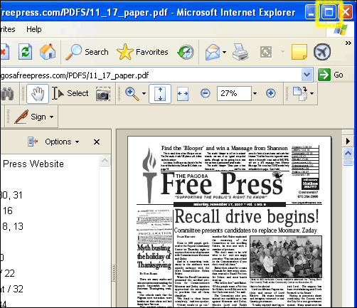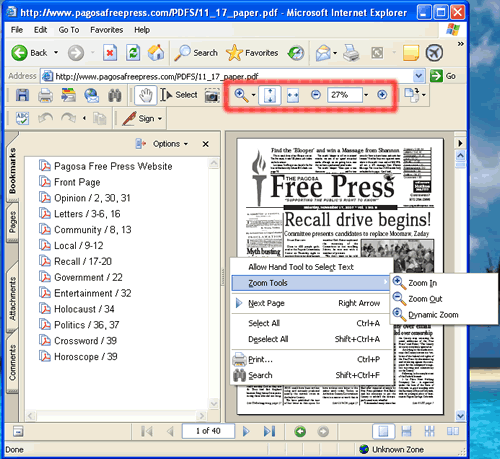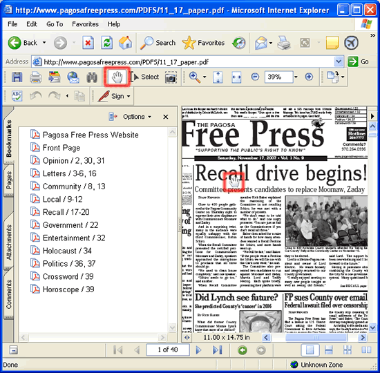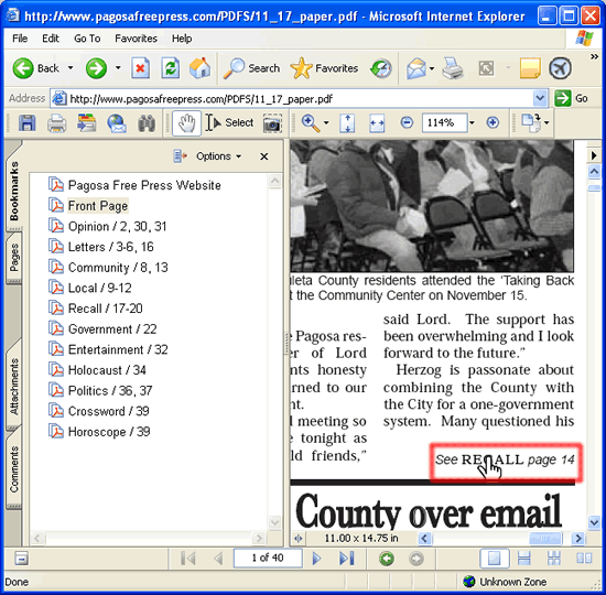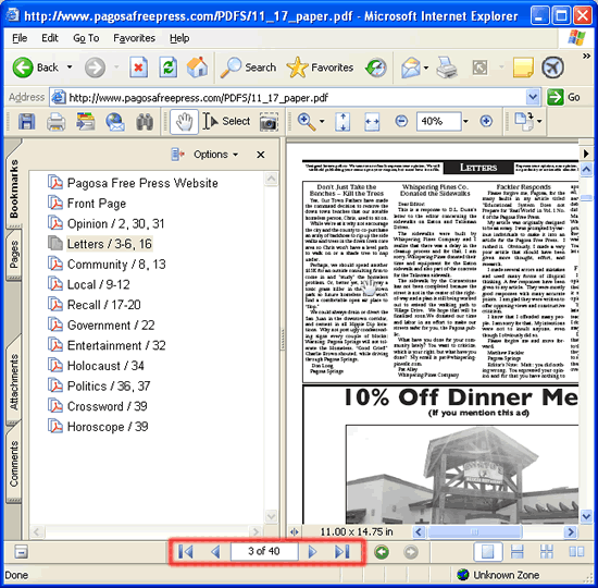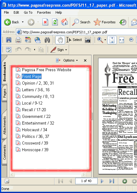 Think of the Bookmarks Panel (highlighted in red below) as an interactive Table of Contents. You can click on any of the items listed and you will jump to that page in the reading panel. The Bookmarks reflect the Table of Contents published in the top right corner of the paper. If you click on "Pagosa Free Press Website" you will return to the PFP home page.